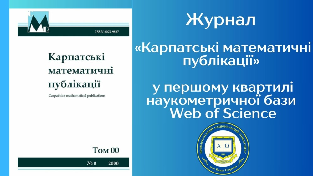 Науковий журнал Прикарпатського національного університету імені Василя Стефаника «Карпатські математичні публікації («Carpathian Mathematical Publications») за результатами роботи у 2023 році потрапив у перший квартиль (Q1) престижного рейтингу Journal Citation Report за показником Journal Impact Factor наукометричної бази Web of Science Core Collection Читати далі