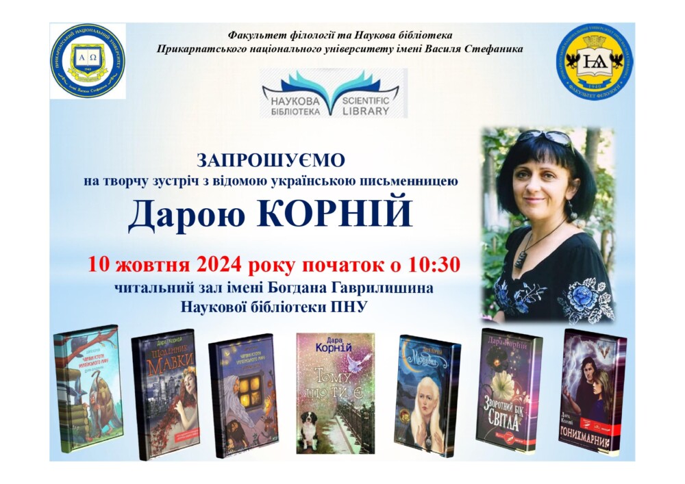 10 жовтня 2024 року о 10:30 год в читальній залі імені Богдана Гаврилишина Наукової бібліотеки ПНУ відбудеться творча зустріч з відомою українською письменницею Дарою Корній.