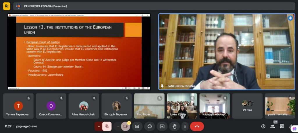 Спочатку професор Уріарте Санчес ознайомив студентів з історією, роллю та функціями основних інституцій Європейського Союзу: Європейського парламенту, Європейської ради, Європейської комісії, Європейського центрального банку та Ради ЄС. Значну увагу було приділено поясненню ключових понять, пов’язаних із діяльністю європейських інституцій, таких як «рішення», «рекомендація» та «думка», а також детально розглянуто законодавчі процедури. Професор також наголосив на принципі верховенства європейського права над національним.