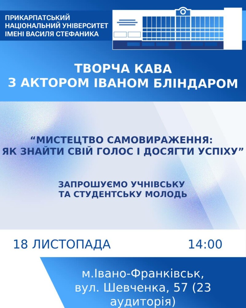 Творча кава з Іваном Бліндаром у Прикарпатському національному університеті імені Василя Стефаника: «Мистецтво самовираження: як знайти свій голос і досягти успіху». Це зустріч з відомим актором театру та кіно, який є нашим випускником! Актор поділиться власними історіями, розкаже як відкрити свій Читати далі