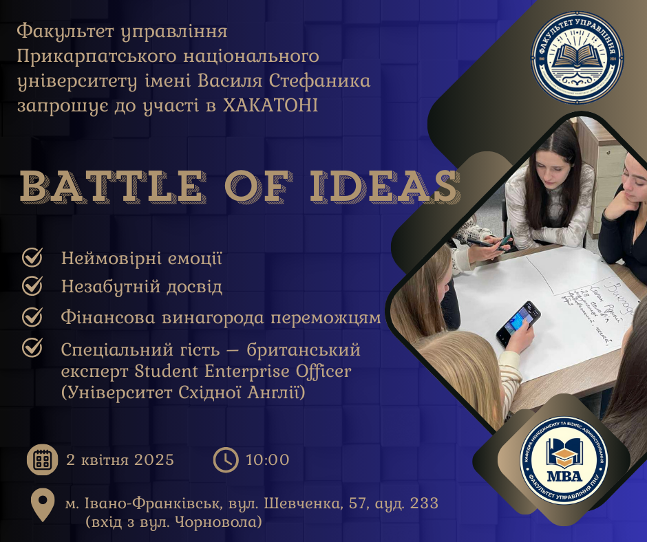 Факультет управління Прикарпатського національного університету імені Василя Стефаника запрошує учнів 10-11 класів та студентів коледжів взяти участь у захопливому хакатоні “BATTLE OF IDEAS”! Дата: 2 квітня 2025 року Час: 10:00 Місце: м. Івано-Франківськ, вул. Шевченка, 57, ауд. 233 (вхід з вул. Чорновола) Читати далі