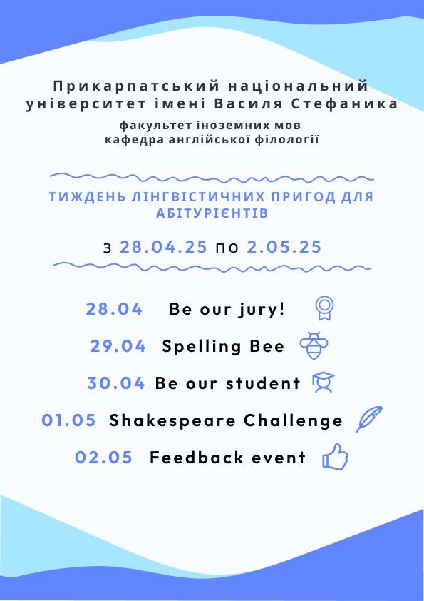Факультет іноземних мов Карпатського (Прикарпатського) національного університету імені Василя Стефаника запрошує учнів 9–11 класів на Тиждень Лінгвістичних пригод – серію яскравих і захопливих подій! На учасників чекають інтерактивні заходи, дружня атмосфера та унікальна можливість побачити, яким є справжнє студентське життя. 28 квітня Читати далі