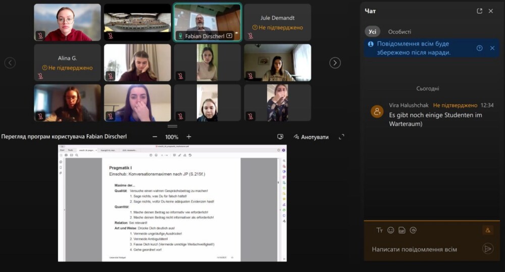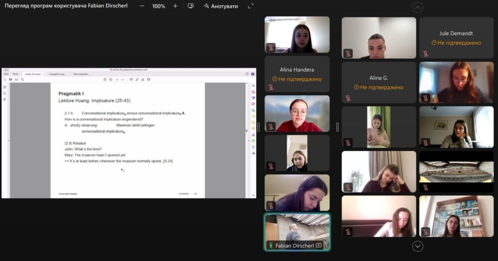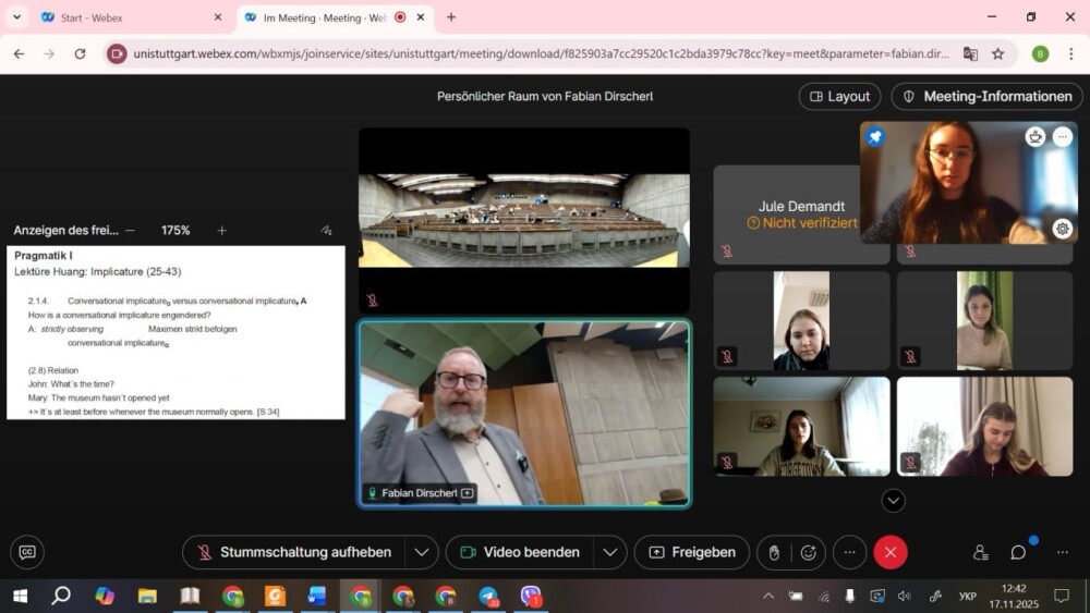 З 15 вересня 2025 року студенти спеціальностей «Німецька мова і література, англійська мова» та «Середня освіта: Німецька мова і література» (належать до кафедри німецької філології) відвідують курс Pragmatik I, який веде Fabian Dirscherl — викладач та науковий співробітник при Інституті лінгвістики в університеті м. Штутгарт та гостьовий доцент Карпатського національного університету (Gastdozent an der Nationalen Wasyl Stefanyk KarpatenUniversitätта координатор проєкту “StuttWay4Ukraine”.