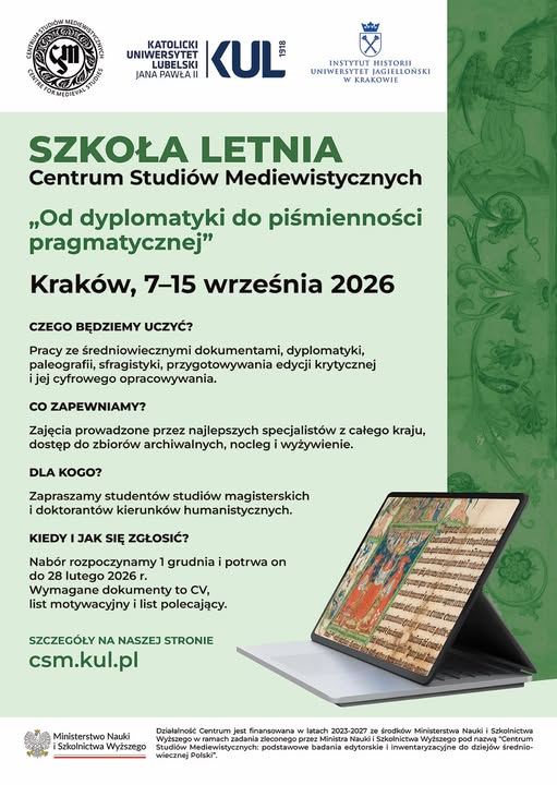 Повідомляємо Вас про можливість взяти участь у черговій Літній школі організованій Centrum Studiów Mediewistycznych на тему “Od dypłomatyki do piśmienności pragmatycznej”, що планується у Кракові упродовж 7-15 Вересня 2026 р. Терміни зголошень – 28 Лютого 2026 р. Запрошуються насамперед магістранти Читати далі