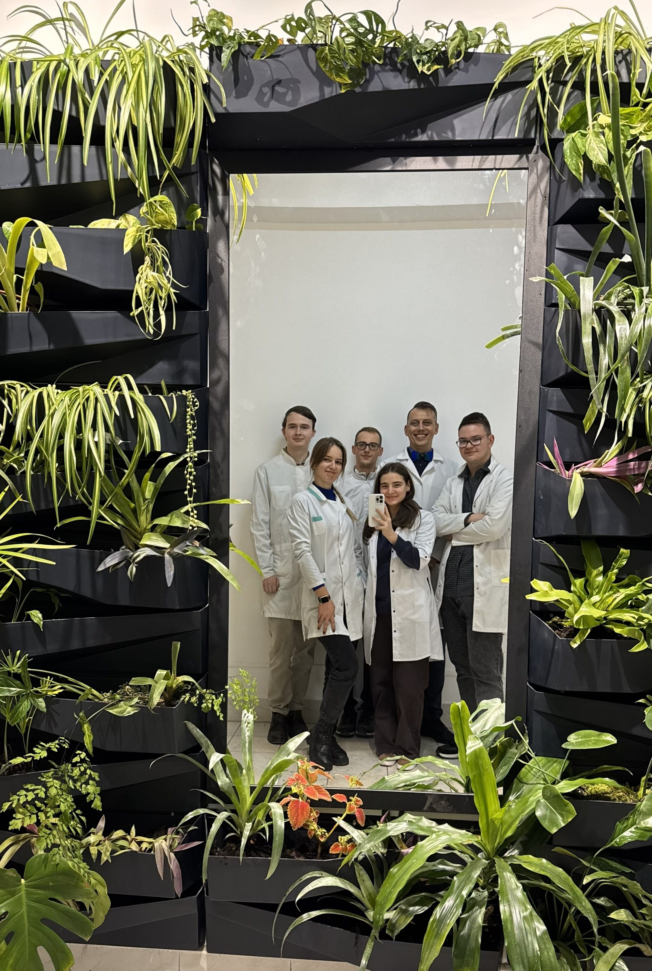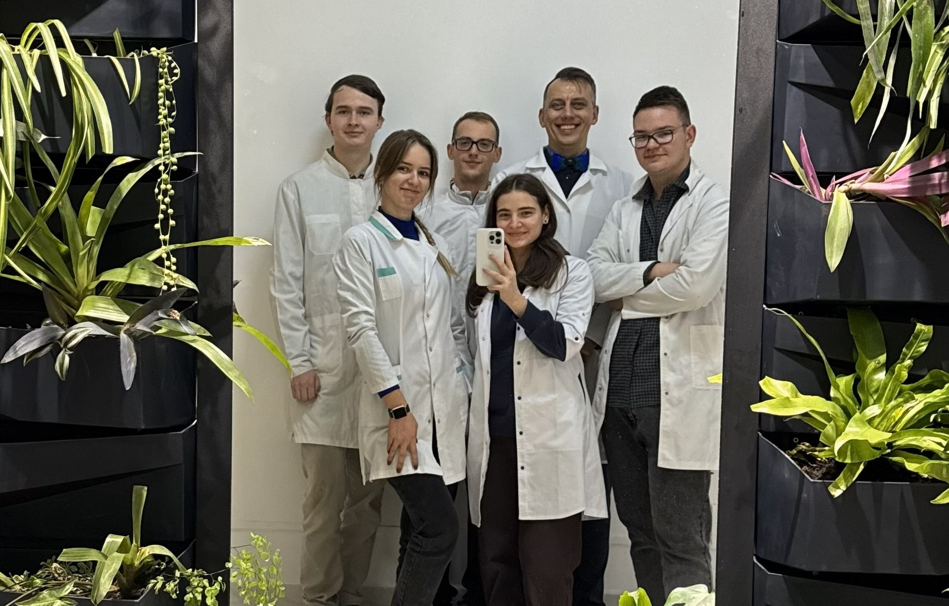 Над створенням «Зеленої стіни знань» працювала натхненна команда студентів: Вікторія Маланій – координаторка проєкту; Ярослав-Юрій Касіцкі та Христина Войтків – креативні менеджери; Ольга Позняк, Олександр Піддубний і Степан Мельник – надійні й незамінними руки проєкту, без яких цей задум не став би реальністю. Водночас проєкт об’єднав значно ширше коло людей: до нього долучалися студенти різних курсів і викладачі кафедри – від першої ідеї до висаджування рослин. Науковий супровід і менторську підтримку на всіх етапах забезпечував доцент Андрій Заморока, чиї фахові поради допомогли команді впевнено пройти всі технічні й біологічні виклики.
